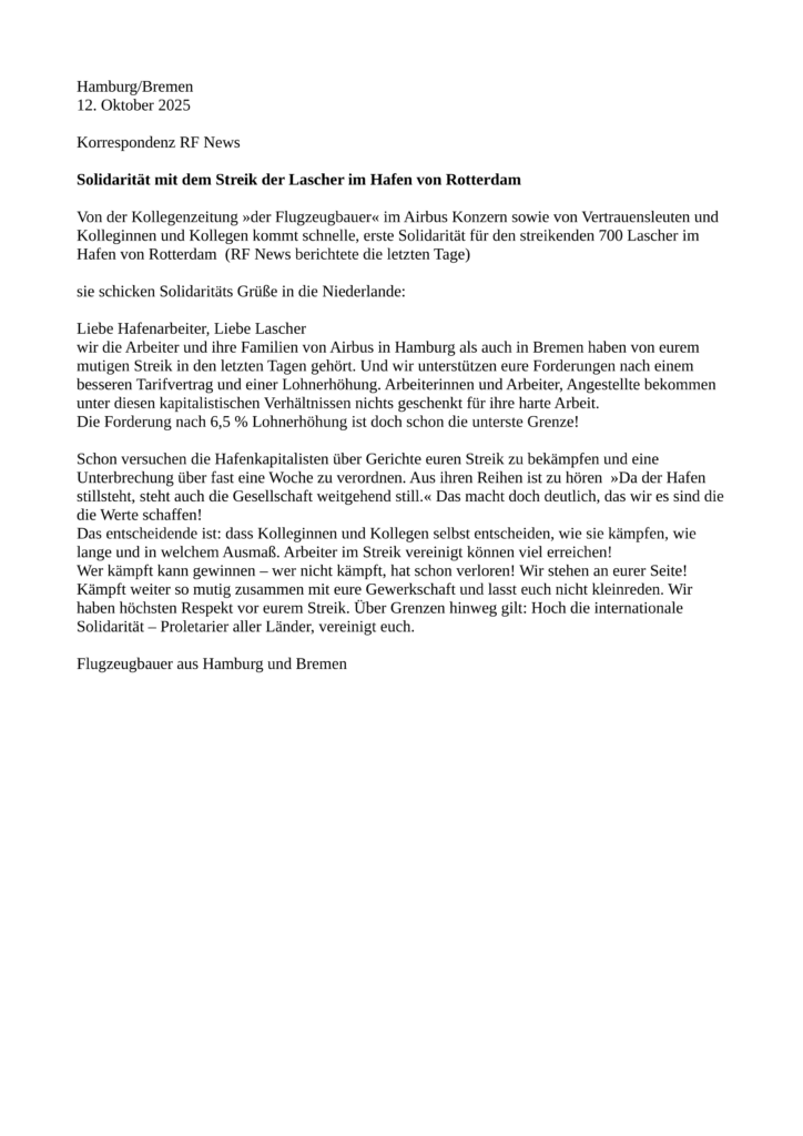 Solidaritätserklärung der Arbeiter bei Airbus in Bremen und Hamburg