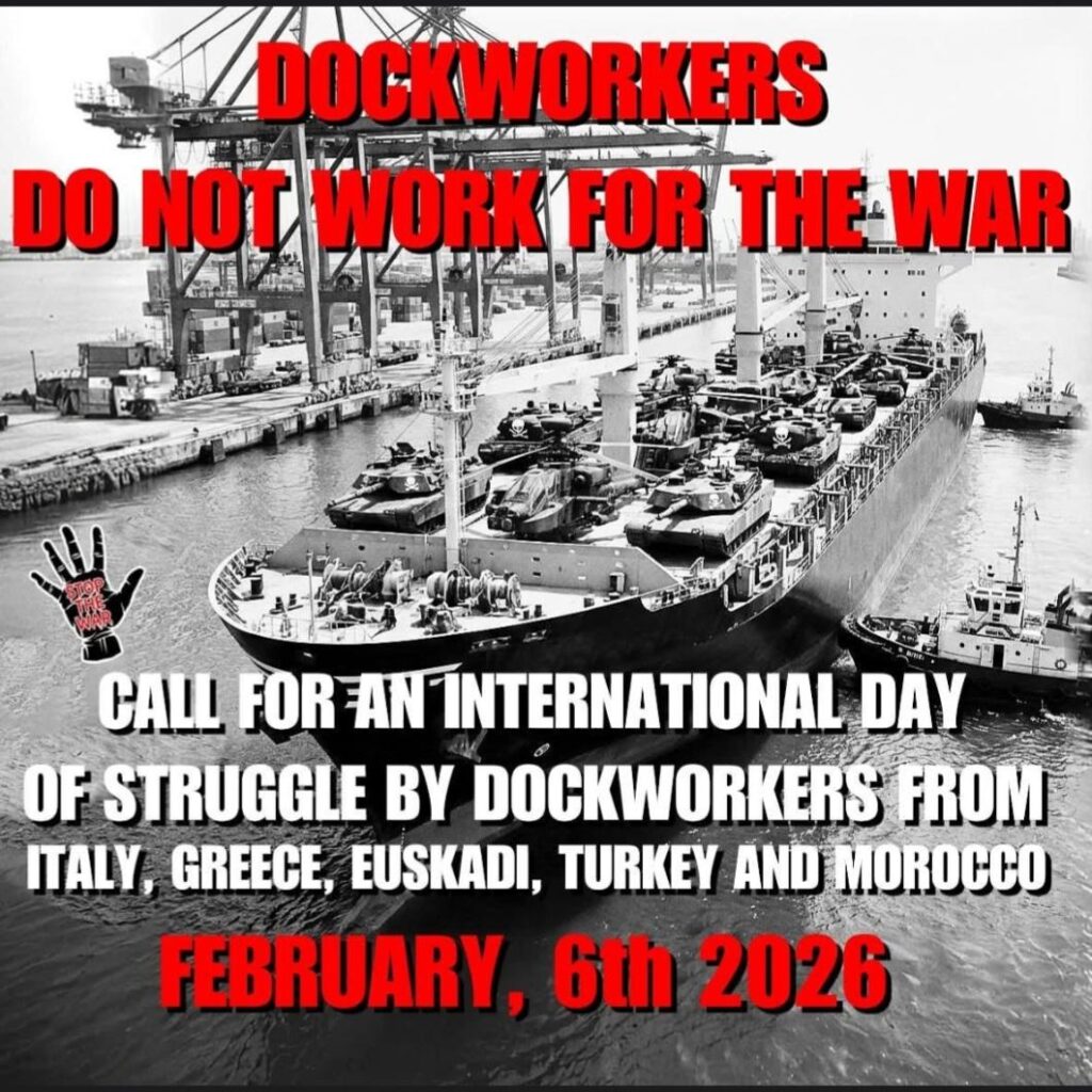 Schon im vergangenen Jahr standen Hafenarbeiter und Seeleute in Griechenland, Italien und anderen Ländern an der Spitze der Proteste, Blockaden und Streiks gegen Hochrüstung, Militärtransporte und für die Palästina-Solidarität. Immer in Verbindung mit ihrem Kampf um ihre sozialen Anliegen. Der 6. Februar kann ein bedeutender Schritt der Höherentwicklung dieser politisierten Kämpfen sein. Der Schlüssel ist die über Ländergrenzen hinweg organisierte Zusammenarbeit und Koordinierung im Geist und der Tat der internationalen Arbeitereinheit! Deshalb gilt es diese Aufruf weiter zu verbreiten und Initiativen für Kampfaktionen am 6. Februar zu ergreifen. Ganz im Sinn des Aufbaus und Stärkung  der  notwendigen proletarischen Einheitsfront gegen Faschismus, Krieg und Imperialismus.